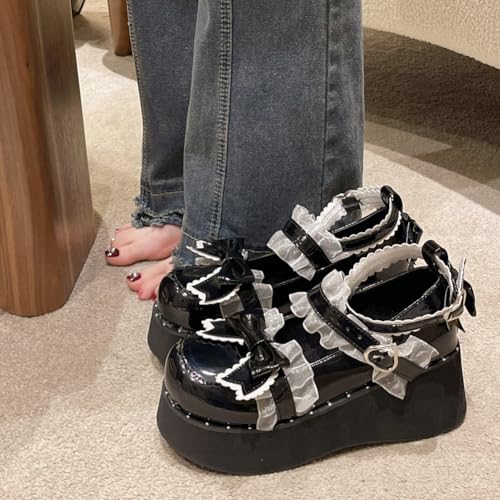 Parisuit Womens Kawaii Lolita Shoes Goth Mary Jane Wedge Heels Platform Pumps Round Toe Bow Cosplay Shoes 4