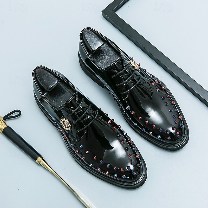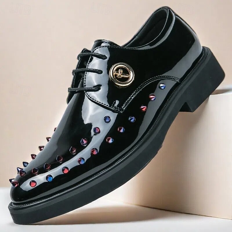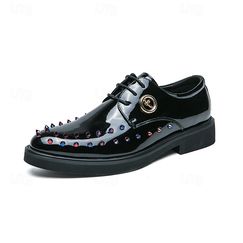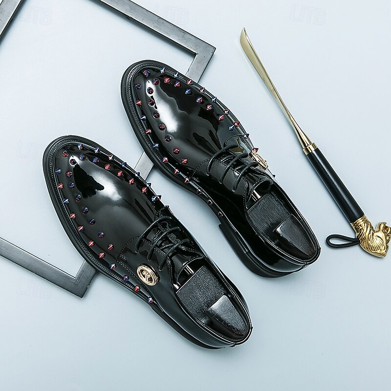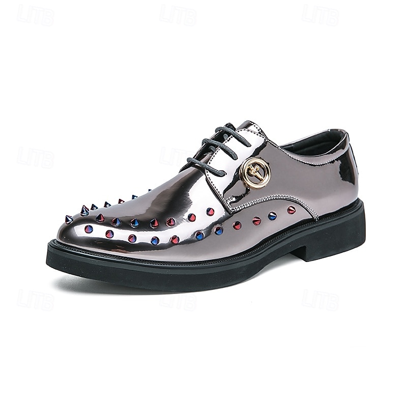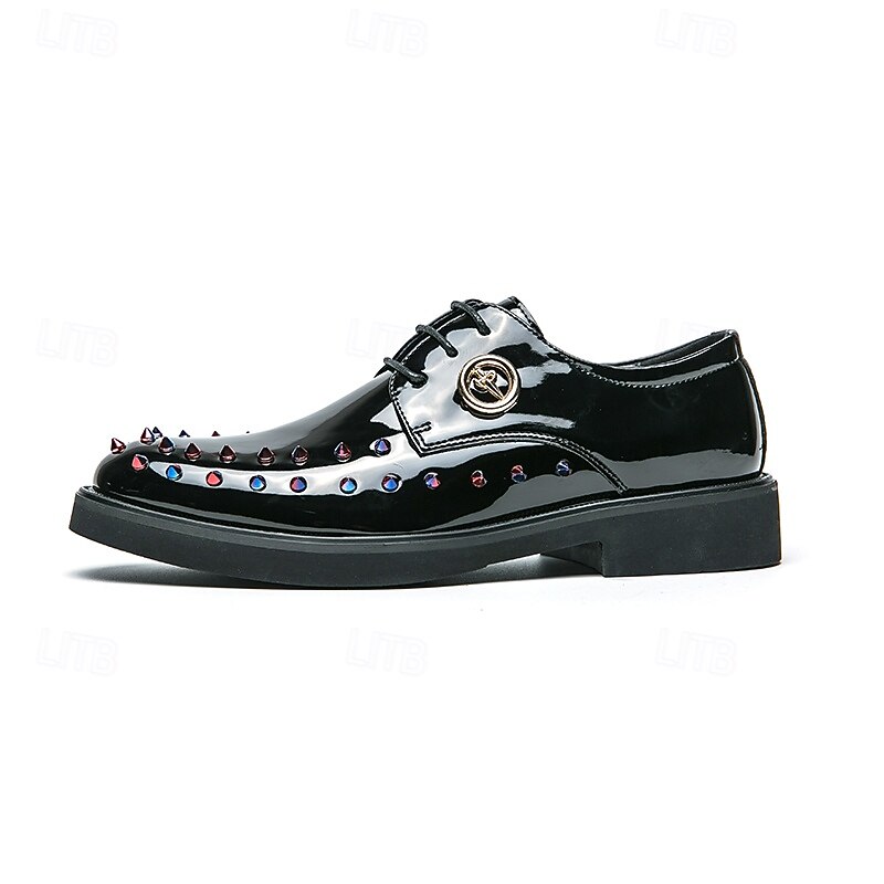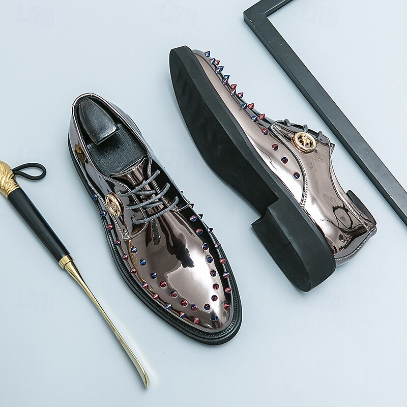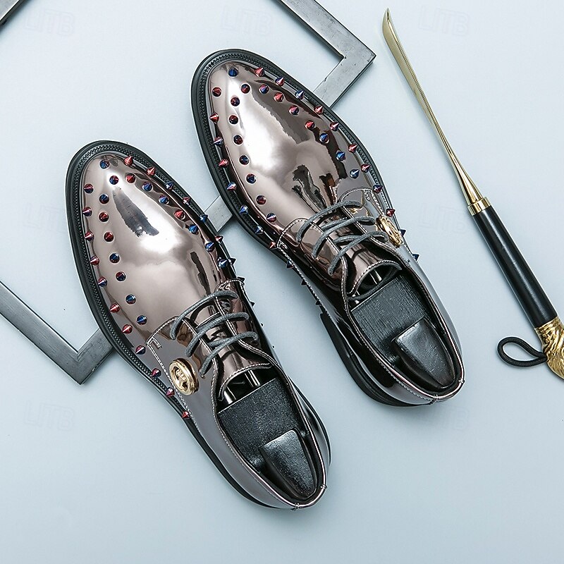 Men's Gold Patent Faux Leather Dress Shoes - Studded Rhinestone Lace-Up Design for Parties, Weddings and Stage Performances 1