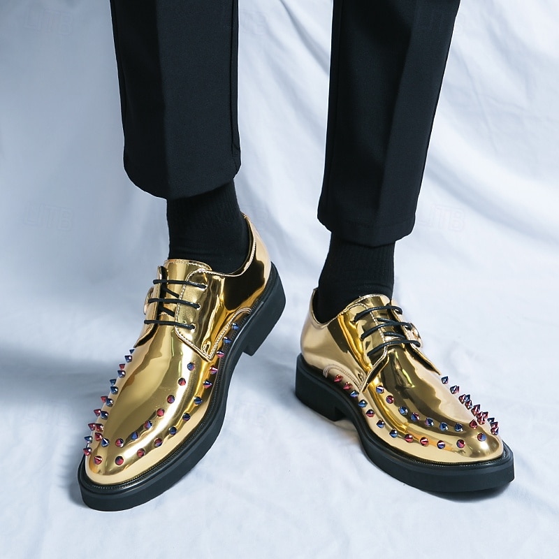 Men's Gold Patent Faux Leather Dress Shoes - Studded Rhinestone Lace-Up Design for Parties, Weddings and Stage Performances 28