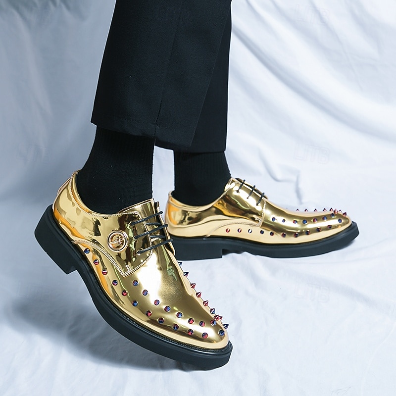 Men's Gold Patent Faux Leather Dress Shoes - Studded Rhinestone Lace-Up Design for Parties, Weddings and Stage Performances 24
