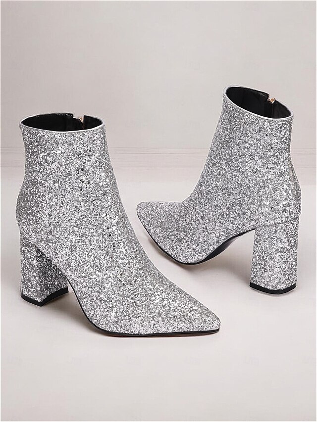 HOT ! Women's Silver Glitter Ankle Boots with Block Heels, Sparkling and Chic for Parties and Special Occasions
