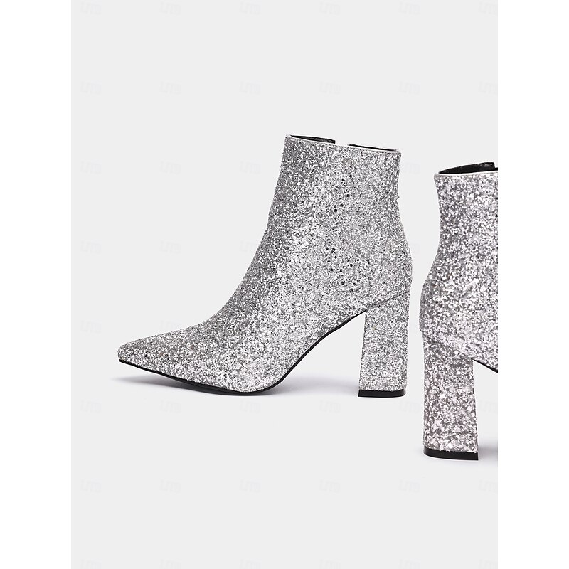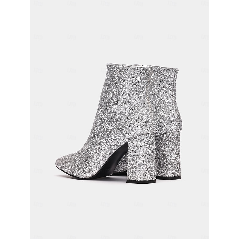 Women's Silver Glitter Ankle Boots with Block Heels, Sparkling and Chic for Parties and Special Occasions 4