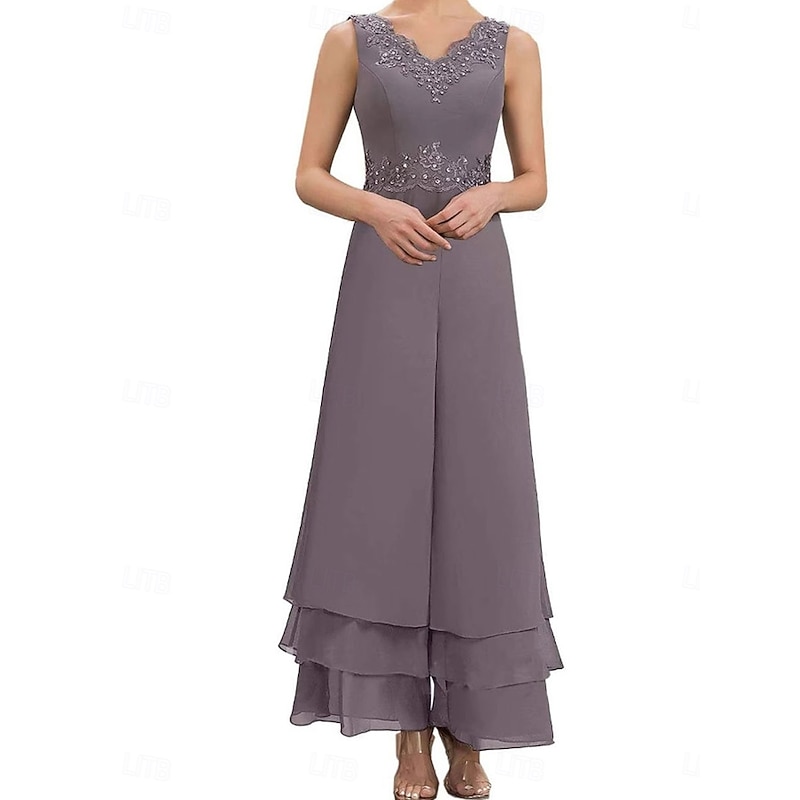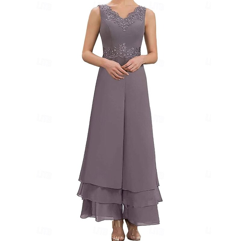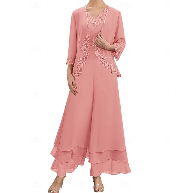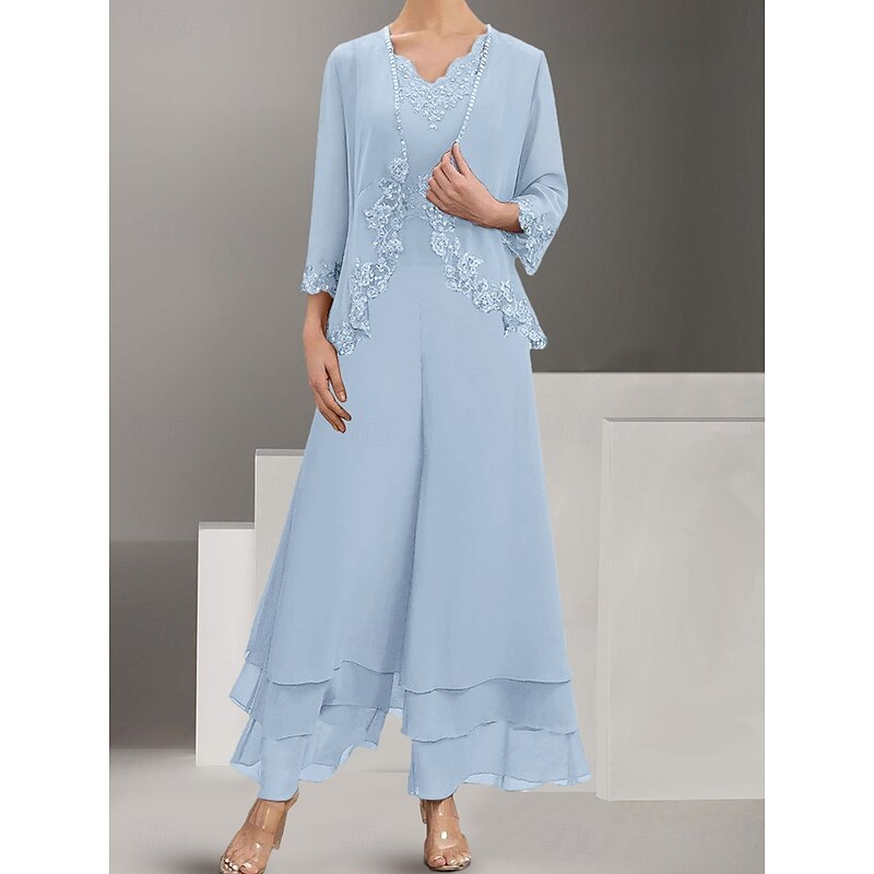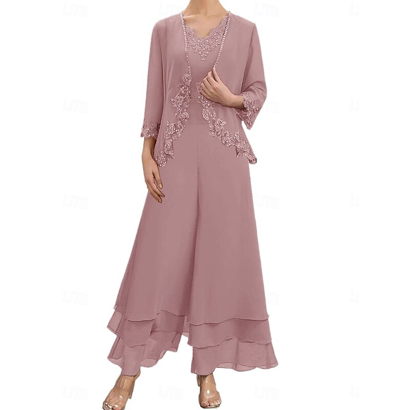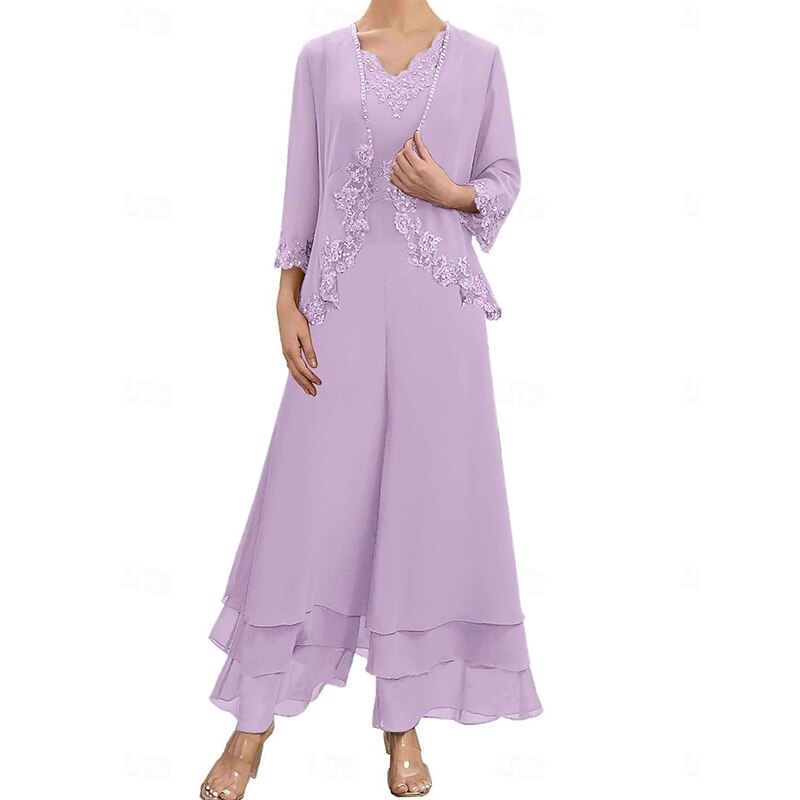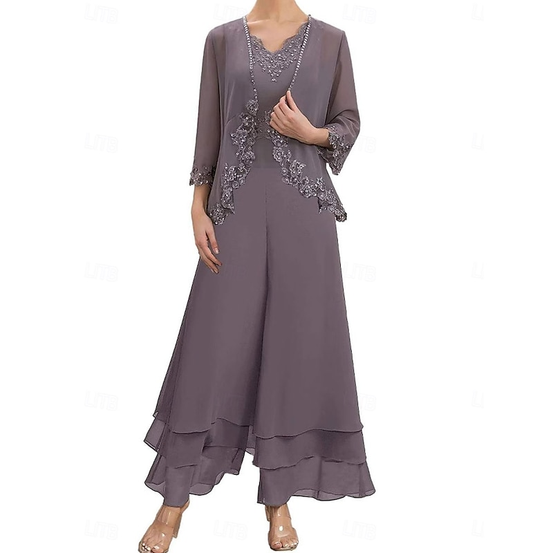Dress Sets Mother of the Bride Dress Wedding Guest Elegant Simple V Neck Floor Length Polyester Long Sleeve with Embroidery 1