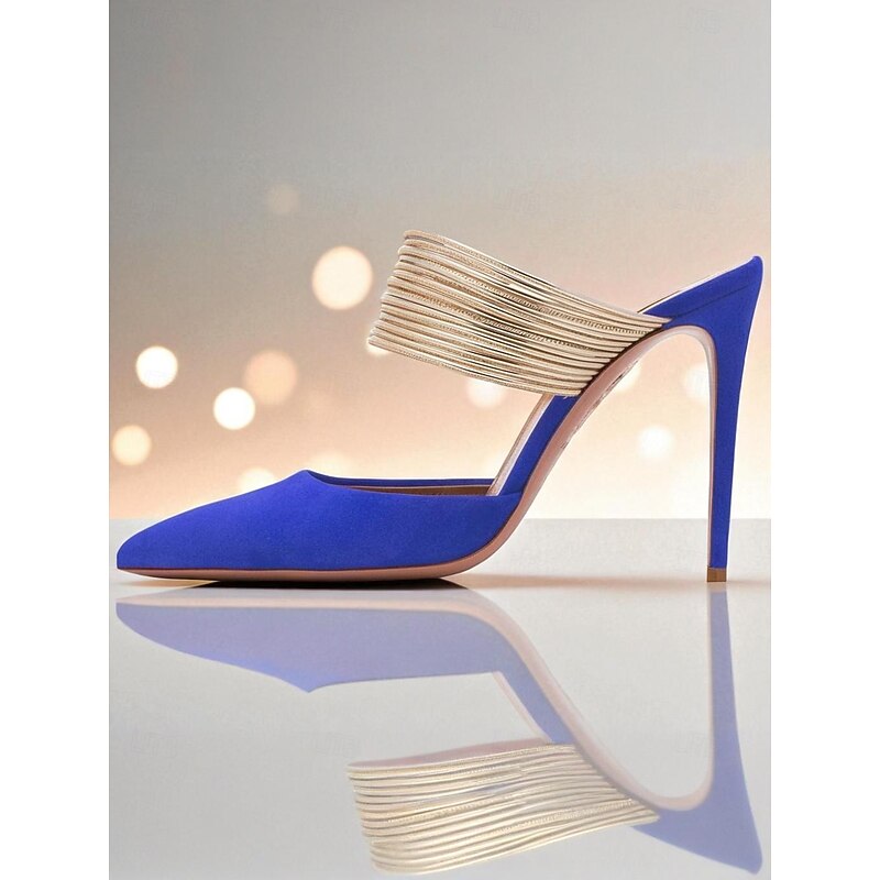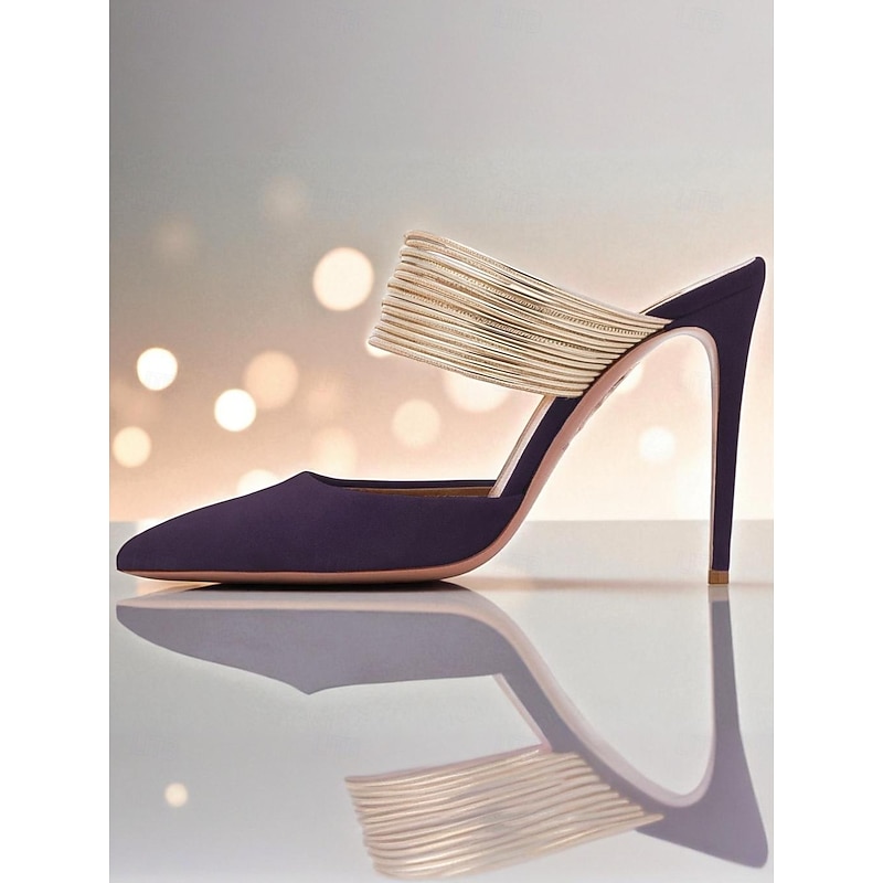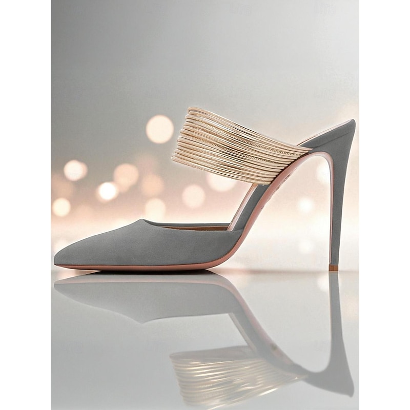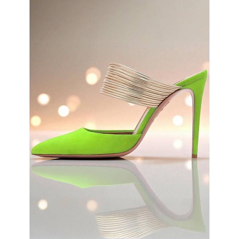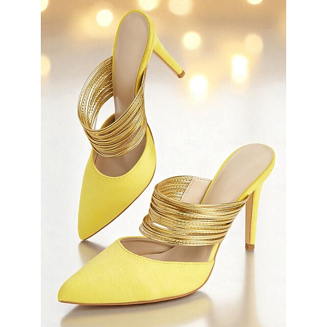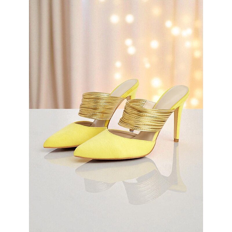 HOT ! Women's Yellow Stiletto Mules with Gold Coil Straps - Pointed Toe High Heels for Nightlife Parties and Evening Events