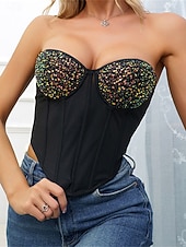 Highlights [Fabric] : Crafted from high-quality polyester, this women's corset top is designed to be breathable and comfortable, perfect for loungewear. The micro-elastic fabric ensures a snug yet comfortable fit, ideal for all-year-round wear. [Silhouette] : The form-fitting silhouette features a structured and supportive design that elegantly accentuates the waistline, giving a flattering and chic look. [Design Highlights] : This corset boasts a luxurious strapless, bandeau neckline, adorned with multicolored sequins for a sparkling effect. The backless feature enhances its modern and stylish appeal, while the included chest pads provide additional support. [Occasions] : Ideally suited for various celebrations including carnival events, date nights, parties, or Valentine's Day, this corset is a versatile piece that adds glamour and sophistication to any outfit. [Size Availability] : Available in multiple sizes including S, M, and L, catering to a range of body types for a perfect and comfortable fit.