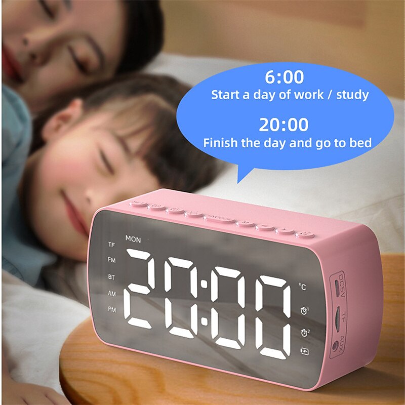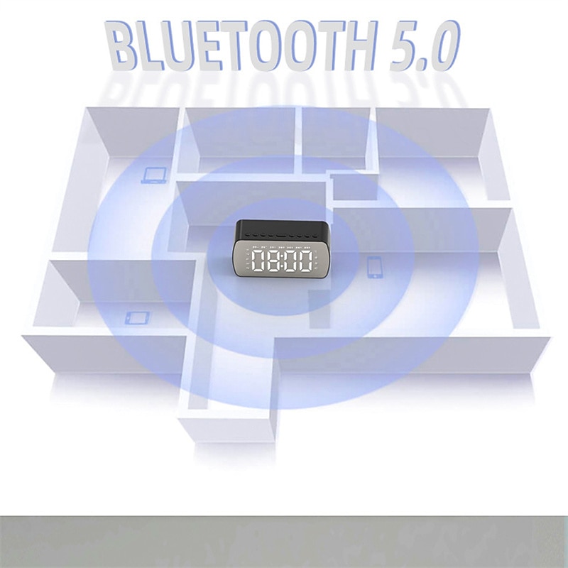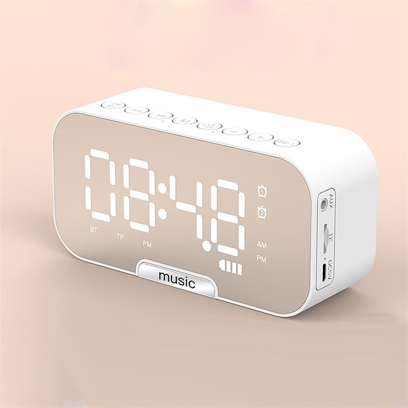 Highlights - Compact Bluetooth speaker with excellent volume levels for rich stereo sound - High-resolution clear sound and stable transmission - Doubles as a digital alarm clock with customized dual alarm modes - Three optional ways to play music: BT mode, TF card mode, and AUX mode - Built-in 1200mAh battery for up to 12-18 hours of music time - Mirror surface alarm clock with 24-hour time setting - High clear mirror screen for touch-ups while listening to music - Large display screen for easy reading of time - Mini size and compact design for easy portability, perfect for travel and home use - Wide application with BT 5.0 technology compatible with most devices - Long transmission distance of up to 10m/33ft (empty space) - FM mode available by pressing the M button - Charging cable serves as the antenna in FM mode - Automatic search feature for radio stations with saved opportunities - Please note that the charging cable is required as an antenna in radio mode.