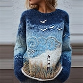 HOT ! Women's Sweater Pullover Daily Casual Graphic Ribbed Crew Neck Knitted Print Long Sleeve Regular Tops Knit Outdoor Weekend Blue Fall Winter