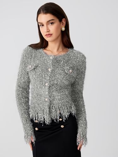 CIDER Fuzzy Round Neck Button Metallic Knitted Long Sleeve Cardigan: Grey, XL 5