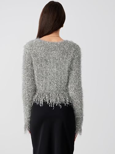 CIDER Fuzzy Round Neck Button Metallic Knitted Long Sleeve Cardigan: Grey, XL 4