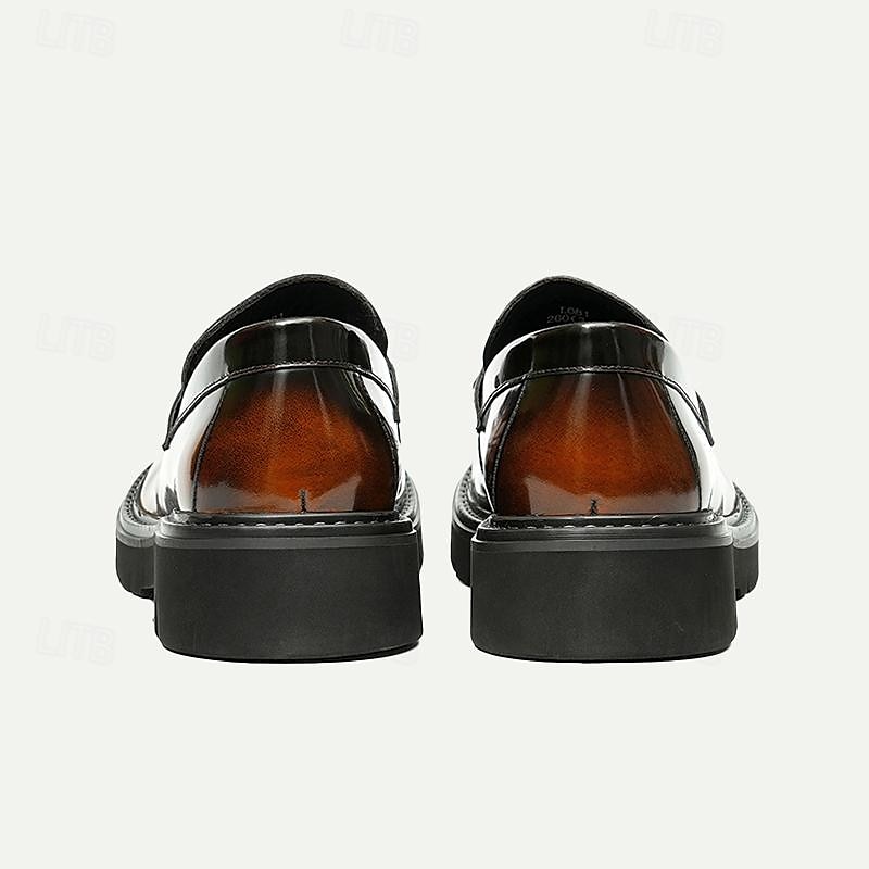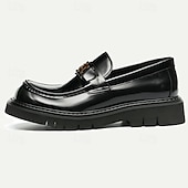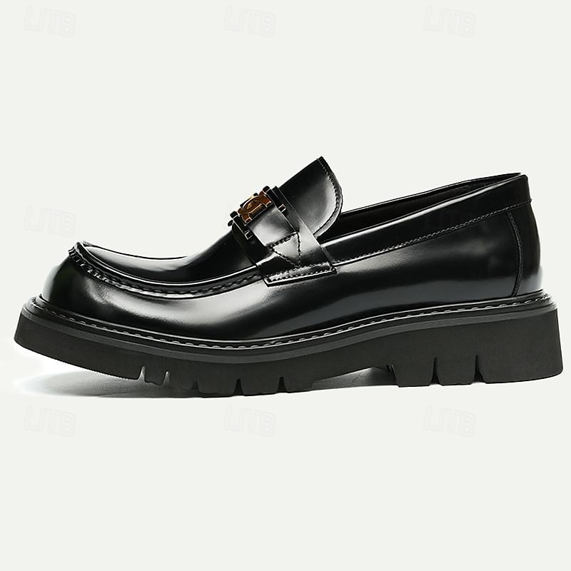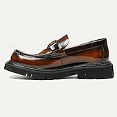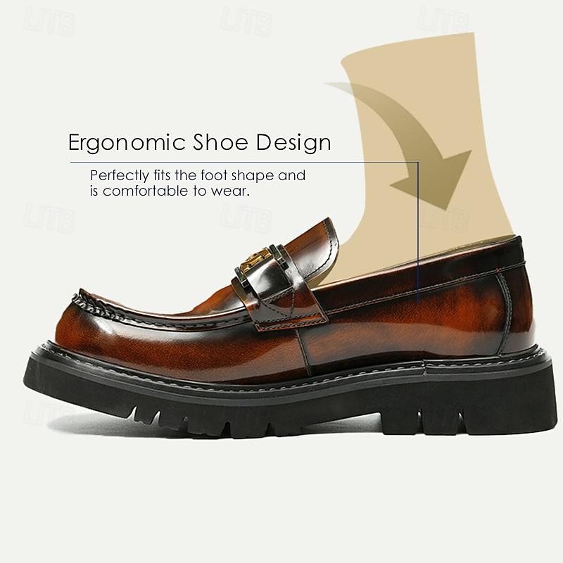 Highlights [Fabric] : Crafted from premium Italian full-grain cowhide leather, these men's loafers offer a luxurious and glossy finish. The quality leather not only ensures durability but also provides a supple and comfortable fit. [Fit] : Designed with a sleek square toe and a loafer closure type, these shoes offer a classic yet modern silhouette. The thick rubber outsole enhances comfort and provides slip resistance, making them perfect for all-day wear. [Design Highlights] : These loafers feature a striking decorative metallic buckle, adding a touch of elegance and modernity to the traditional loafer style. The combination of rich brown color and gold chain detail further enhances the shoe's sophisticated appeal. [Occasions] : Ideal for formal events, business meetings, and smart-casual occasions, these loafers are versatile enough to complement both professional and relaxed settings. Whether dressing up for a special event or enhancing a casual outfit, they embody timeless style. [Size Notice] : Available in a wide range of sizes from US6 / EU39 / UK5 to US13 / EU46 / UK12, ensuring a suitable fit for various preferences and requirements.