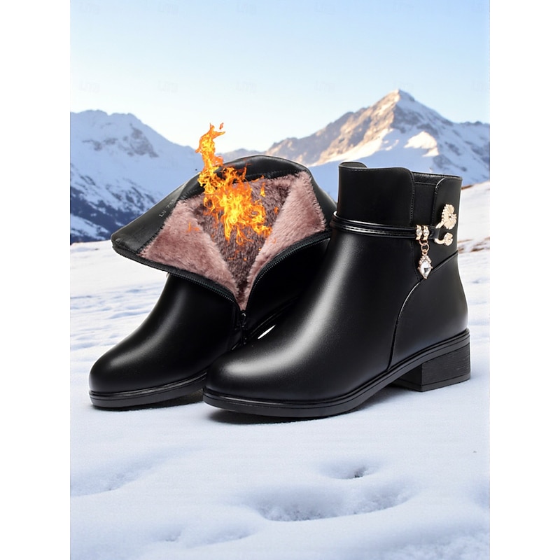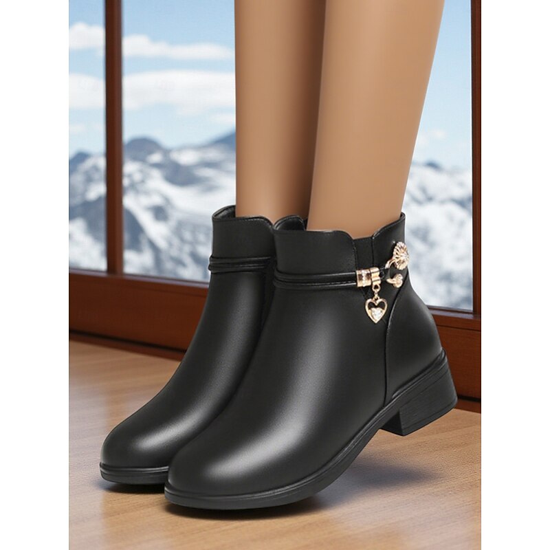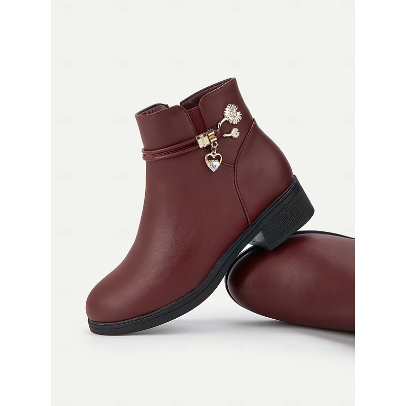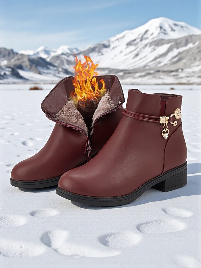 HOT ! Women's Warm Fur-Lined Ankle Boots - Burgundy Low Heel Winter Booties with Gold Charm Details for Snow,Outdoor Travel and Cold Weather Commute