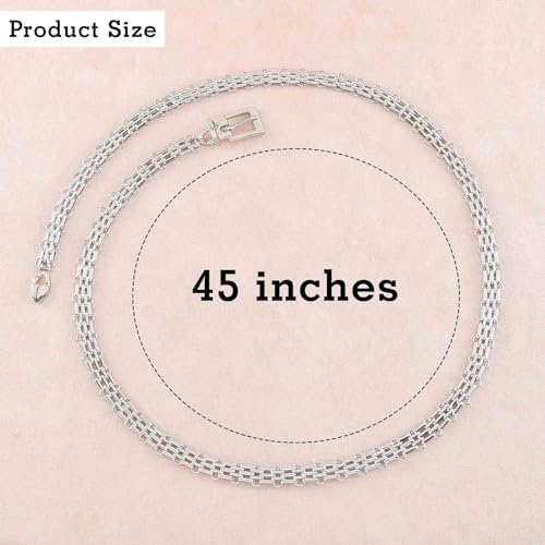 • This 45-inch belt chain for women comes in gold or silver. It goes with dresses, jeans, halter skirts, leather trousers and more.