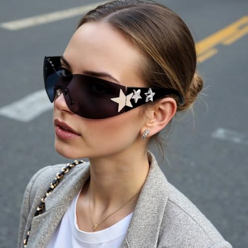 Y2K Sunglasses for Women Men Trendy Shield Wrap Around Sun Glasses Rimless Star Sunglasses Oversized Glasses Shades 5