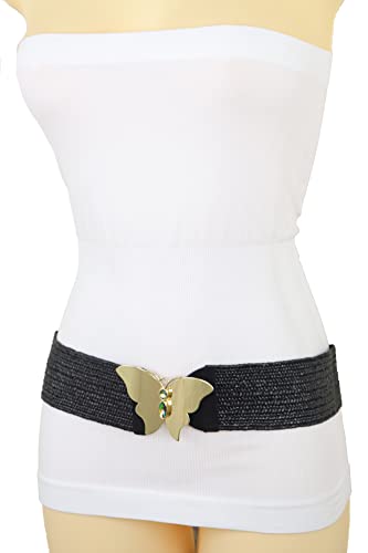 Women Fashion Elastic Black Belt High Waist Hip Gold Metal Butterfly Buckle S M 1