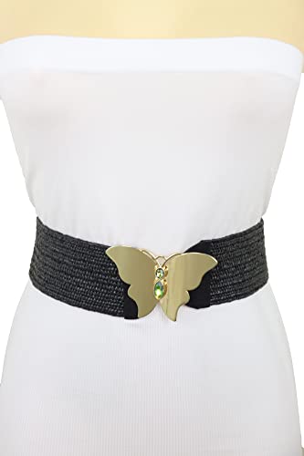 Women Fashion Elastic Black Belt High Waist Hip Gold Metal Butterfly Buckle S M 6