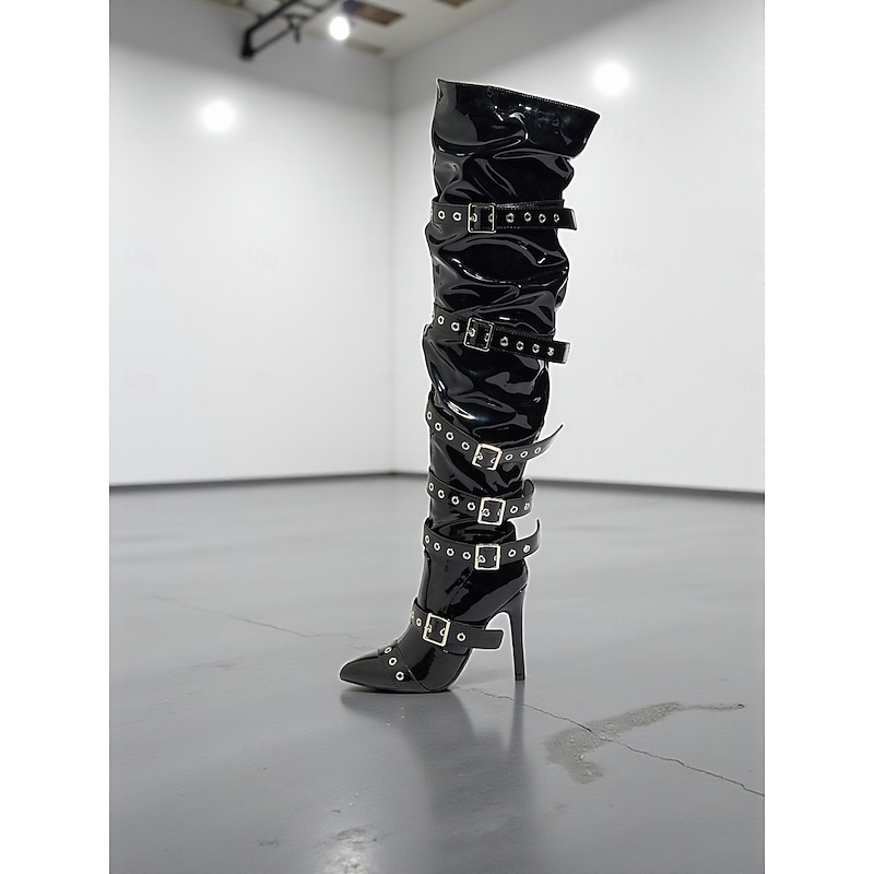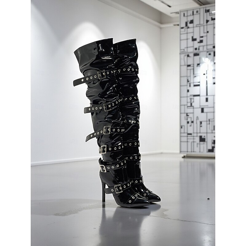 Women's Patent Leather Over the Knee Boots with Multi Buckle Strap Detailing Pointed Toe Stiletto Heel Gothic Punk Style Boots for Urban Party Wear 1