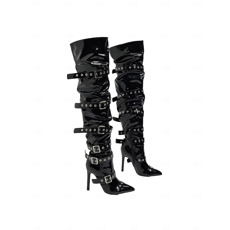 HOT ! Women's Patent Leather Over the Knee Boots with Multi Buckle Strap Detailing Pointed Toe Stiletto Heel Gothic Punk Style Boots for Urban Party Wear