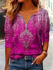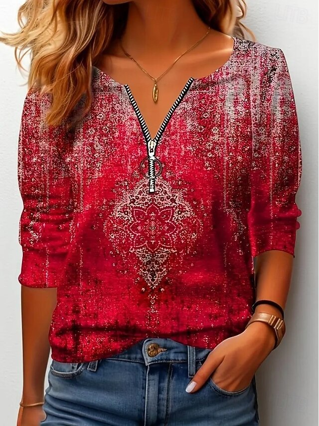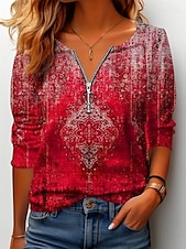 More information about Women's T shirt Long Sleeve Quarter Zip Long Sleeve Casual Graphic Color Gradient Abstract Bohemia Vintage Stylish V Neck Regular Tops Daily Red Fuchsia Spring Prefall