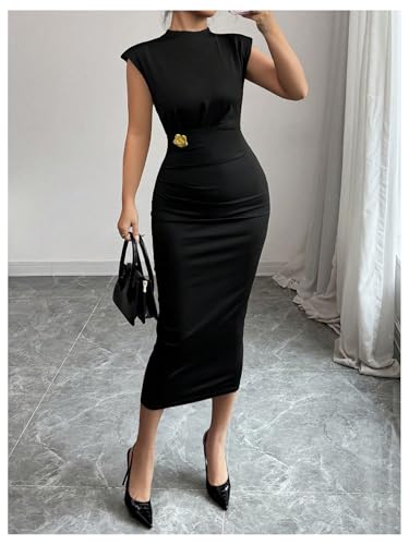 SOLY HUX Women's Elegant Mock Neck Sleeveless Bodycon Midi Dress 3D Floral Business Work Dresses 3