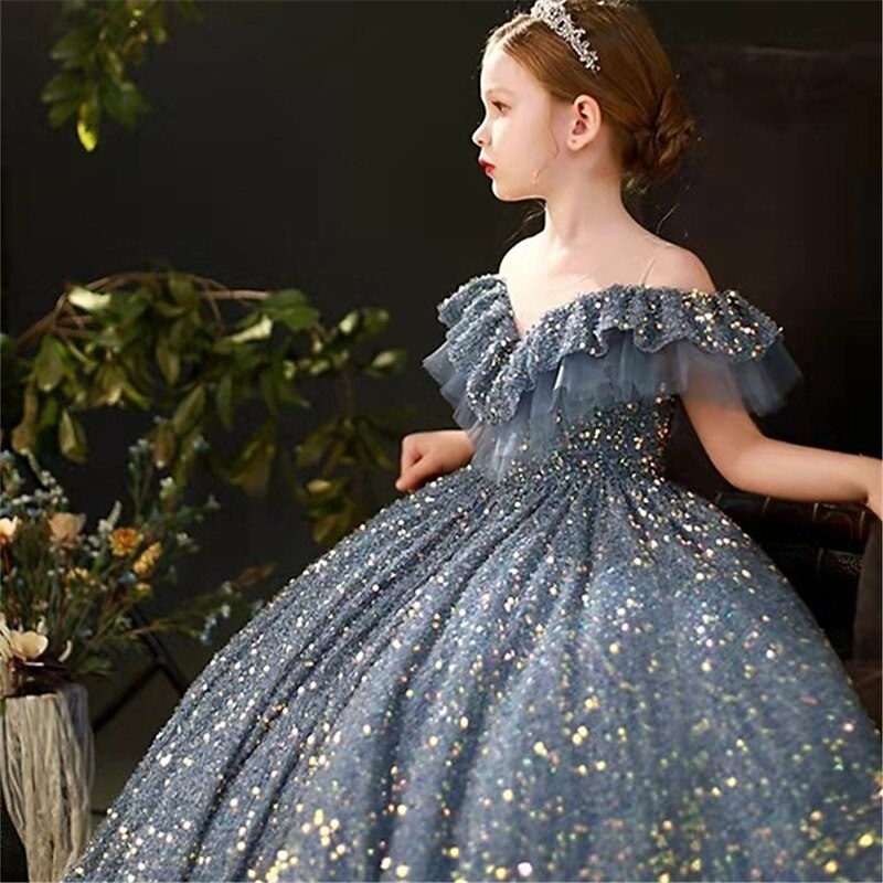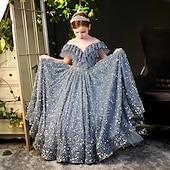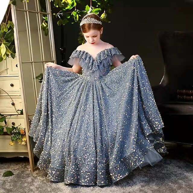 More information about Kids Girls' Dress Sequin Swing Dress Wedding Special Occasion Sequins Ruched Mesh Dusty Blue Maxi Short Sleeve Princess Cute Dresses
