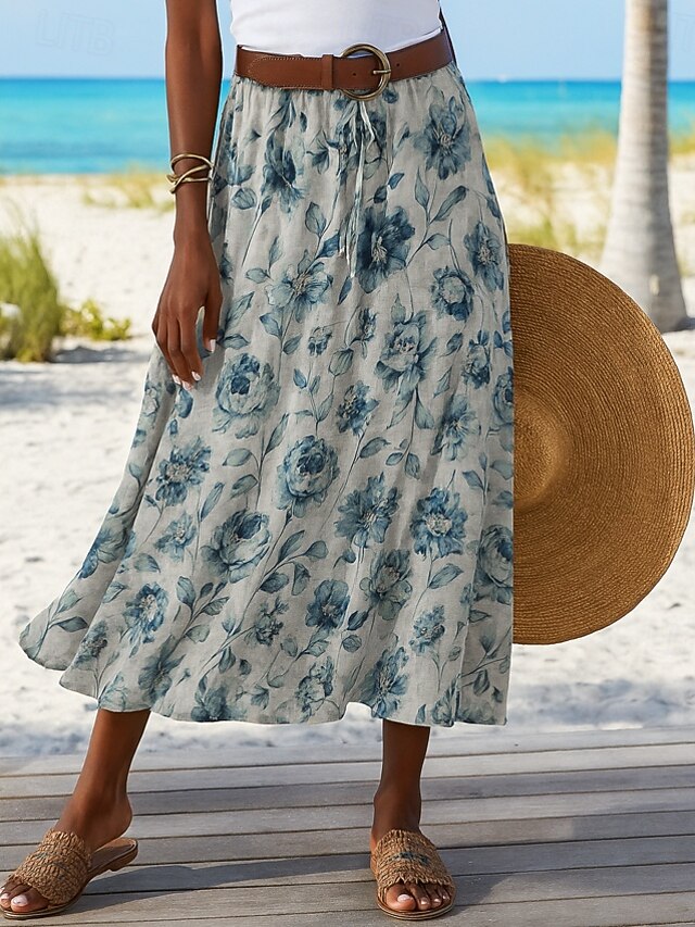 Women's Long Skirt Elegant Bohemia Vintage Casual Maxi High Waist Skirts Floral Inelastic Vacation Causal Picture color Summer Cotton Linen 5