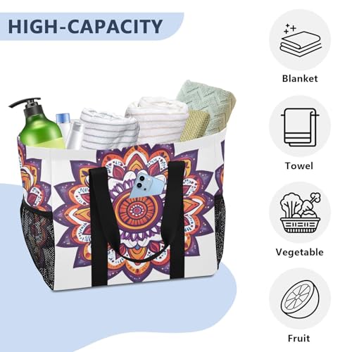 HOT ! Large Waterproof Travel Tote Bag for Women Men, Floral Indian Mandala Canvas Beach Bag with Lining & Pockets - Reusable Grocery/Laundry/Kitchen/Pool/Picnic Tote (15.4x9.8x12.8in)