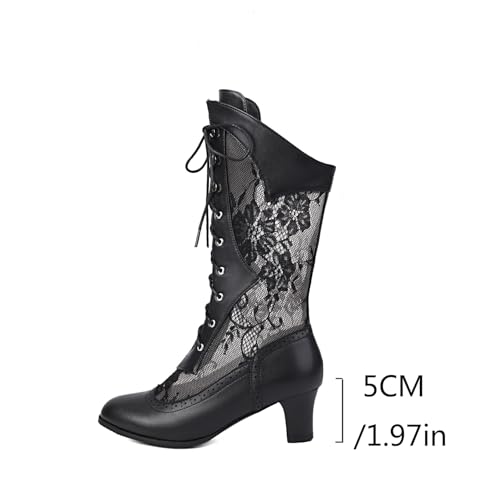 Goth Victorian Boots for Women Gothic Chunky Heels Lace Fishnet Mid-calf Boot Lace-up Wedding Cosplay Witch Costume Booties Shoes 6
