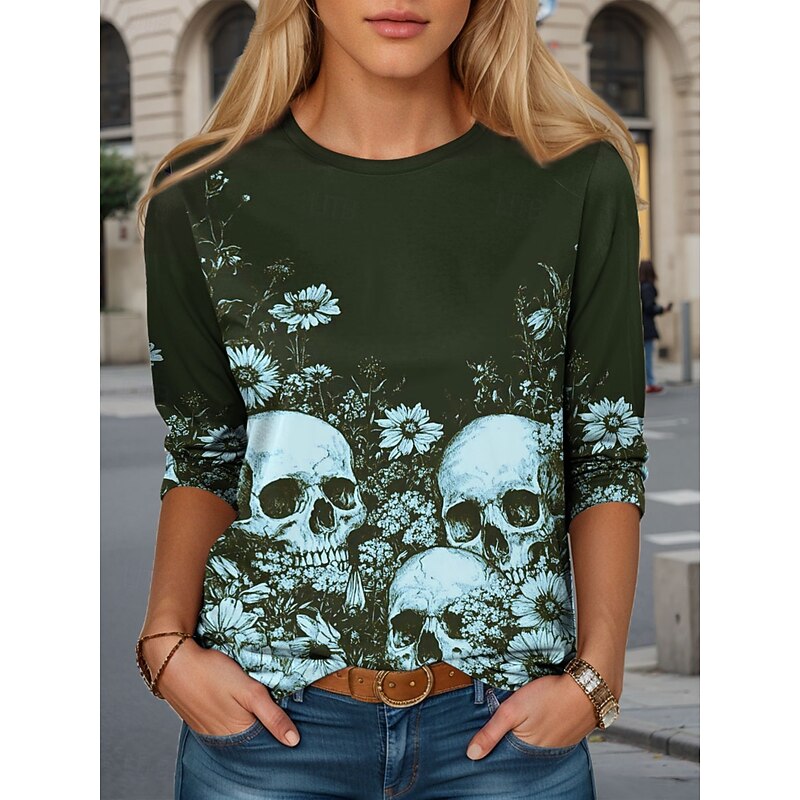 Halloween Women's T Shirt Skulls Crew Neck Long Sleeve Tunic Graphic Casual Round Neck Regular Tops Daily Print Pink Blue Purple Green Fall 7