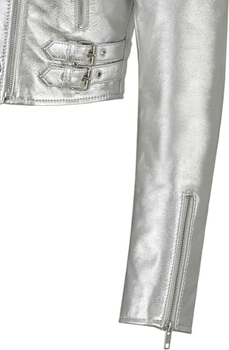 HOT ! SpazeUp Women's Cropper Leather Jacket - Ladies Short Body Biker Leather Jacket Silver Golden