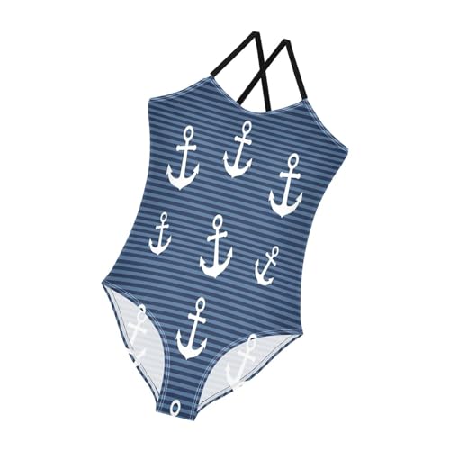 White Anchors Stripes Navy Blue Swimsuits for Girls One Piece, Summer Beach Swimsuit Girls, 3-10 5