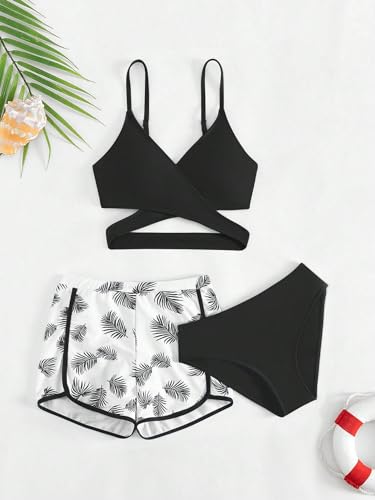 trending ! OYOANGLE Girl's 3 Piece Swimsuit Criss Cross Wrap Bikini Sets with Tropical Print Beach Shorts