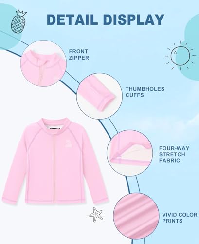 Fabric type: 86% Polyester, 14% Spandex.Care instructions: Machine WashOrigin: ImportedNeck style: Crew NeckSize Guideline - 30-32'' (12-18 Months), 33-36'' (18-24 Months), 37-40'' (2-3 Years), 41-44'' (3-4 Years), 45-48'' (5-6 Years). Please refer to the Size Chart on the pictureSun Protection - Certified UPF 50+, the unisex kids UV protection full zip rash guard shirt blocks 99.69% of harmful UV rays. Perfect for swimming, beach trips, summer camp, water parks, hiking, fishing, surfing and anytime your little boy or girl needs reliable sun protectionThoughtful Design β Featuring long sleeves, this adorable baby toddler zip-front swim shirt offers ample coverage to protect your little one's skin. The full zipper with a chin guard ensures easy on-and-off, while thumb holes provide extra comfort and freedom of movement, ideal for a vibrant summerHigh Quality - The sun protective zip-up surfing shirt is made of lightweight, quick-drying fabrics that are softer and more comfortable than normal fabrics. Expertly sewn with four-thread flatlock stitching for added durability and comfortSummer Fun Ready - This baby toddler zip-front swim top comes in a variety of vibrant colors and fun patterns. Pair it effortlessly with swim trunks, shorts, or skirts for a sophisticated and playful beach or pool look. Slip into this vibrant water beach shirt and make every summer moment unforgettable Perfect for everyday use. superior materials and excellent craftsmanship ensure long-lasting durability.