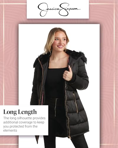 Jessica Simpson Women's Long Puffer Jacket - Quilted Winter Coat with Faux Fur Trim Hood - Insulated Coat for Women (S-XL)