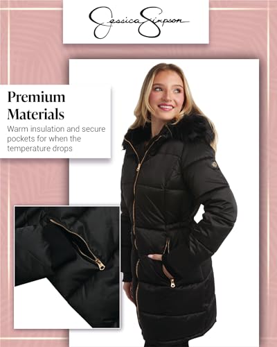 Fabric type: 100% PolyesterCare instructions: Machine WashOrigin: ImportedOFFICIALLY LICENSED JESSICA SIMPSON: Long Puffer Coat for Women; Looks to layer from day to nightCOZY AND WARM PROTECTION: Stay warm and sophisticated with the Jessica Simpson Women's Long Puffer Coat. Designed with a quilted pattern that traps heat, this jacket offers excellent insulation, perfect for cold winter days. The long silhouette provides additional coverage to keep you protected from the elements.FAUX FUR TRIMMED HOOD: The puffer coat comes with a luxurious faux fur-trimmed hood that adds a touch of elegance while providing extra warmth around your face and head. The hood is detachable, allowing you to customize your look based on the weather and your style preferences.DURABLE ZIPPER AND POCKETS: Equipped with a sturdy front zipper and functional pockets, this puffer coat offers convenience and practicality. The zipper closure ensures that you stay fully zipped up against the cold, while the side pockets are perfect for storing small essentials or keeping your hands warm.ADJUSTABLE FIT: This coat features a drawstring waist for a customizable fit, allowing you to adjust the coat to your comfort level and silhouette preference. The rib-knit cuffs and hem further help to seal out the cold and provide a snug fit, making this coat both functional and flattering. Perfect for everyday use. superior materials and excellent craftsmanship ensure long-lasting durability.