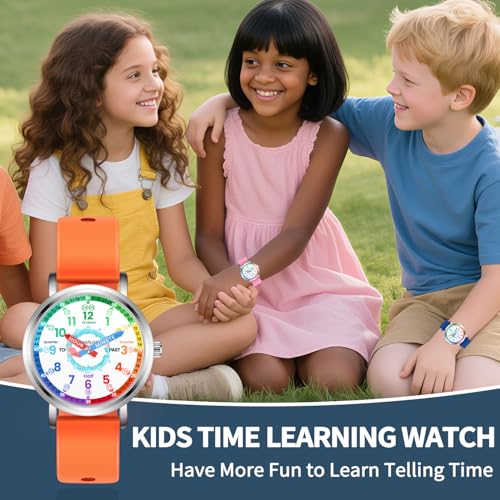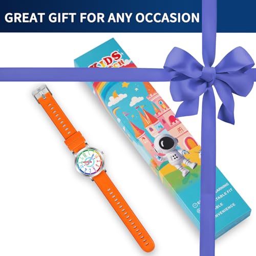 EASY READ TIME LEARNING - Kids watch makes learn to tell the time more easier and funny. Colorful dial shows all minute numbers for children easier to read time. HOUR and MINUTE are labeled on Watch hands for accuracy.COMFORTABLE & SOFT - High quality silicone watch band with 17 HOLES for ultimate adjustment, wrist circumference between 5.3 and 8.3 fit for children's wrist well.RELIABLE QUALITY - Precise battery, SHOCK RESISTANT alloy case, STAINLESS STEEL back, worry free and long lasting use.WATER PROOF 3 ATM - kids watches Water resistants with 100 feet (30 meters), stand with hand wash, occasional splashes or rain. BUT DO keeping them away from shower and swimming.DIY WATCH GIFT FOR ANY OCCASION - children watch is a best gift for kid's birthday, back to school, Christmas, etc. QUICK RELEASE watch band makes it changing a breeze easily. Kids can DIY their own watch styles. Perfect for everyday use. High quality materials and excellent craftsmanship ensure long-lasting durability.