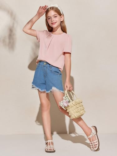 Girls Shirts Summer Short Sleeve Cute Tops Chiffon Pleated Blouses 5-14 Years