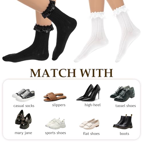 Fabric type: Polyester + NylonCare instructions: Machine WashOrigin: ImportedPattern: Solid【Exquisite Design】This ruffle socks woman features ribbed design and satin lace ruffle design, adding a touch of playful sophistication to your outfit, perfectly showing your sweet and fashionable style.【retro Two-color Optional】The package contains 2 pairs of women's ruffle socks, including classic black and white, which can enhance the overall shape and are suitable for most women and girls.【Easy to match】This frilly socks women has a simple and versatile design, easily combining fashion and comfort, and can be perfectly matched with various clothing. It is a practical item for any wardrobe.【High-quality material】This women's lace ruffle socks is made of high-quality polyester + nylon fabric, and the soft and breathable fabric ensures comfortable wearing.【Wide Application】This lace socks women is very suitable for daily wear, office wear, masquerade and festival activities, allowing you to show fashion charm in the crowd. Perfect for everyday use. excellent materials and excellent craftsmanship ensure long-lasting durability.