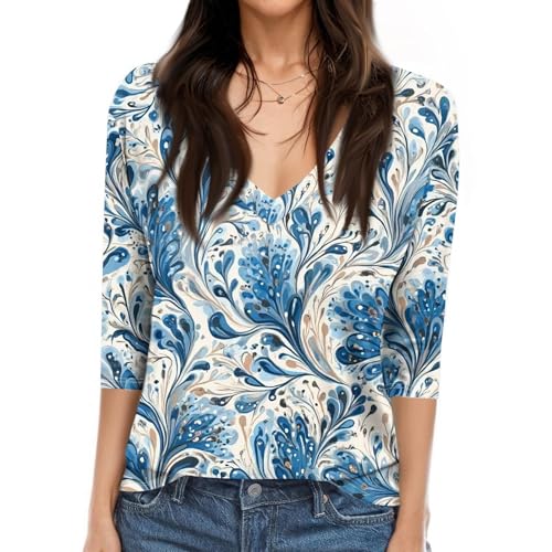 trending ! Womens Summer 3/4 Sleeve Tops 2025 Floral Print V Neck Casual Shirts Loose Fit Three Quarter Sleeve Blouses