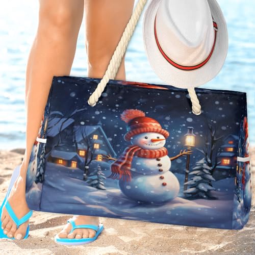 Large Beach Tote Bags for Women Snowman Winter Christmas Xmas Waterproof Sandproof Shoulder Bags Swim Pool Purse with Zipper Beach Vacation Essentials for Summer Swim Pool Travel Gifts