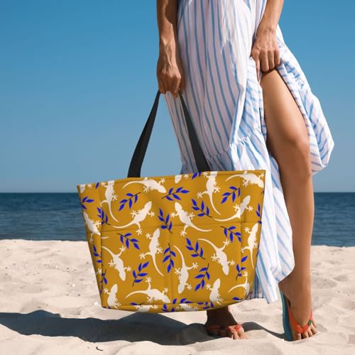 White Gecko Lizard Blue Leaves Large Beach Bag Waterproof Sandproof Swim Tote Pool Bag For Women With Zipper