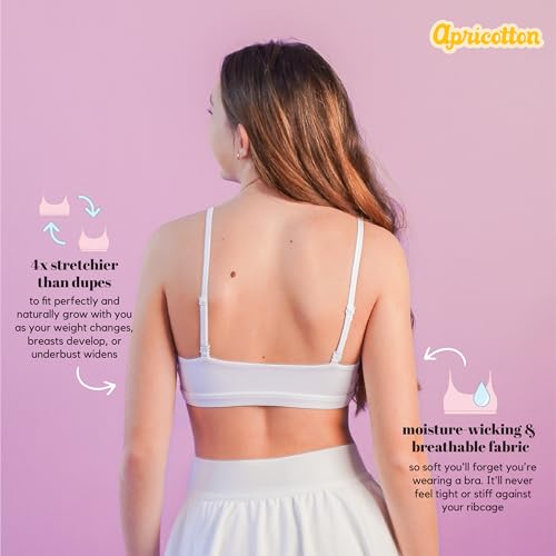 Fabric type: 85% Nylon, 15% SpandexCare instructions: Hand Wash OnlyOrigin: ImportedClosure type: Pull-OnBRA DESIGNED FOR GIRLS: Apricotton bras are specially designed for young girls who need a plush, supportive bra that empowers them as they go through puberty. She should never have to worry about flimsy, unsupportive teen bras that restrict her movement.PERFECT 2.0: Our starter bra is a must-have for any girls that are in their development stages. It’s ultra-lightweight, buttery soft, and completely invisible under any outfit, making Apricotton the perfect teen bra for everyday wear. Designed with first-time bra wearers in mind, it’s stretchy and comfortable to ensure that her first bra adapts to her body and lifestyle perfectly.A BRA THAT GROWS AS SHE GROWS: Our bras for teens are designed to stretch to fit her body from when she's flat-chested to fully developed, so it'll always fit perfectly. Finding your size? That's easy: tightly wrap a piece of string or measuring tape around your under-bust, and use our size chart. No confusing cup sizes, just a perfect supportive girls training bra that adjusts to her needs.ULTIMATE COMFORT: With our soft, stretchy, and triple-layered fabric, this training bra shapes to her body to maximize comfort. It comes with removable padding so that she can choose her coverage and is completely invisible under any top, giving her a bra that she’ll love to wear everyday.BUTTERY SOFT: Our padded bralette is crafted with moisture-wicking and breathable fabric so she can accomplish anything. Made with 85% nylon and 15% spandex, it feels smooth and weightless, perfect for active teens looking for comfort and style. Perfect for everyday use. premium materials and excellent craftsmanship ensure long-lasting durability.