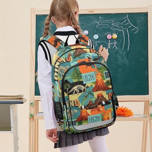 Kids School Backpack for Boys Girls, Retro Dinosaur S Large Girls Backpack with Chest Strap, 6-12 Y School Bag with Front Flap, 17 Inch