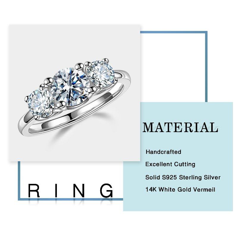 • DETAILS: This 3 Stone moissanite engagement rings with 1 6.5MM 1CT moissanite center stone and 2 brilliant matched round cut 5MM 0.5CT moissanite, 1 ct tw. Secured by 14K White Yellow Rose Gold Vermeil Solid S925 Sterling Silver 4 prong, handcrafted inlaid and polished, stone and solid, made to last a life time. Ensure the gemstone never fall, born to be shiny forever.