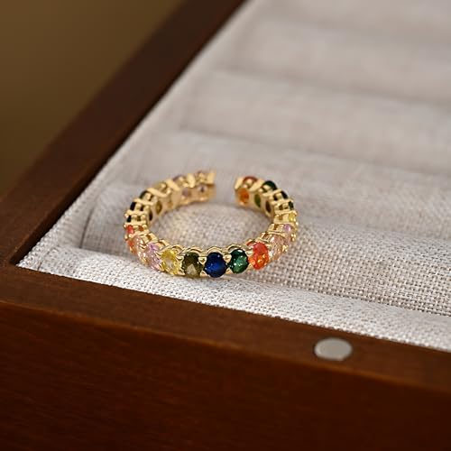 Rainbow Cubic Zirconia Gold Ring for Women, 18K Gold Plated Colorful Eternity Band, Dainty Stackable Open Rings, Birthday Jewelry Gift