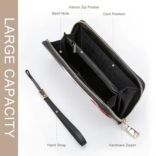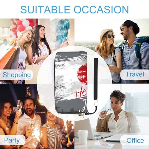 Japanese Flag Hello Japan Women's Leather Clutch Wallet with Zip Card Holder Hand Strap Large Capacity