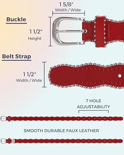 Red Vegan Leather Belt for Women - Wavy Edge Silver Buckle - Adjustable Waist Belt for Jeans, Dresses & Fashion
