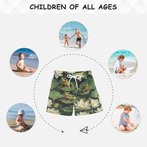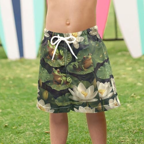Pigsaly Boys' Swim Board Shorts White Lotus Flowers Watercolor Green Frogs Boy's Swim Trunks Kids Swimwear XS