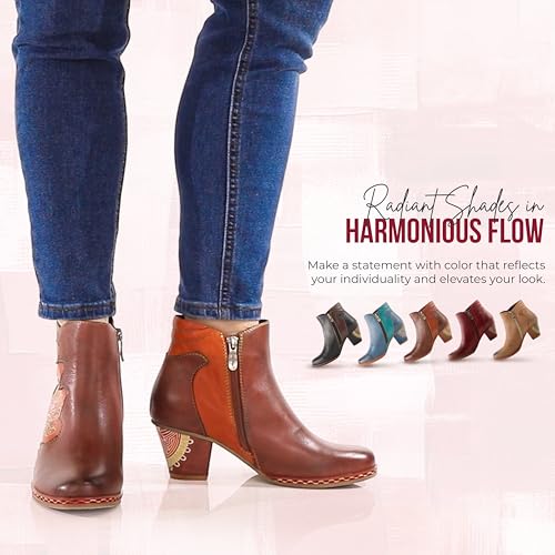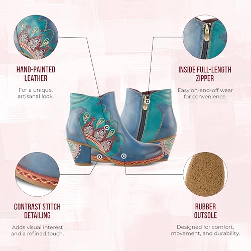 • Hand-painted leather booties, burnished, and polished design, inside full-length zip and brushed metal pull tab, padded topline, hand-painted leather covered heel, Comfort, Flexible Sole, Hand-painted, Padded Insole, Premium, Textured