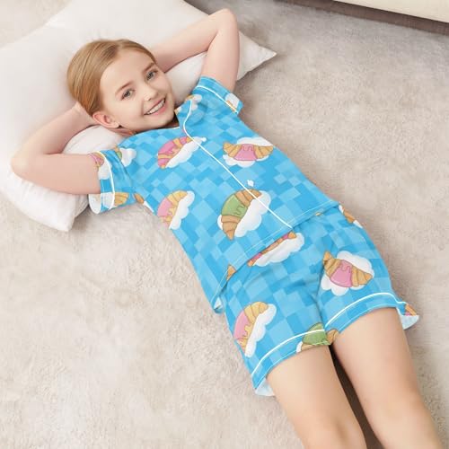 Satin Pajama Sets Short Sleeve Croissant on Cloud Button Down Silky Nightwear 2 Piece PJS 5-14Y