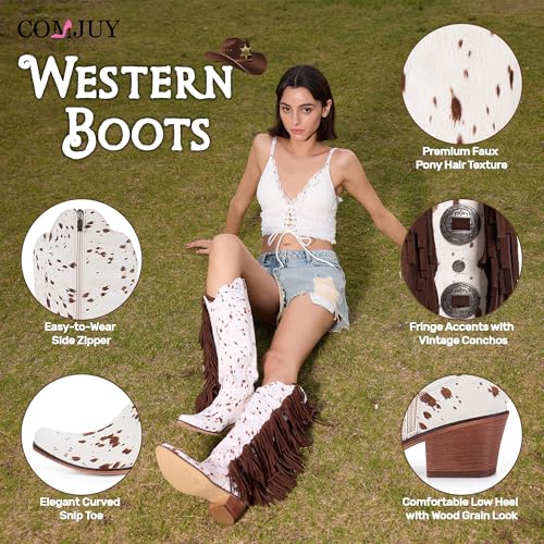 Cow Print Western Boots for Women Fringe Tall Cowboy Boots each Season Mid Heel Country Style Riding Boots with Side Zipper